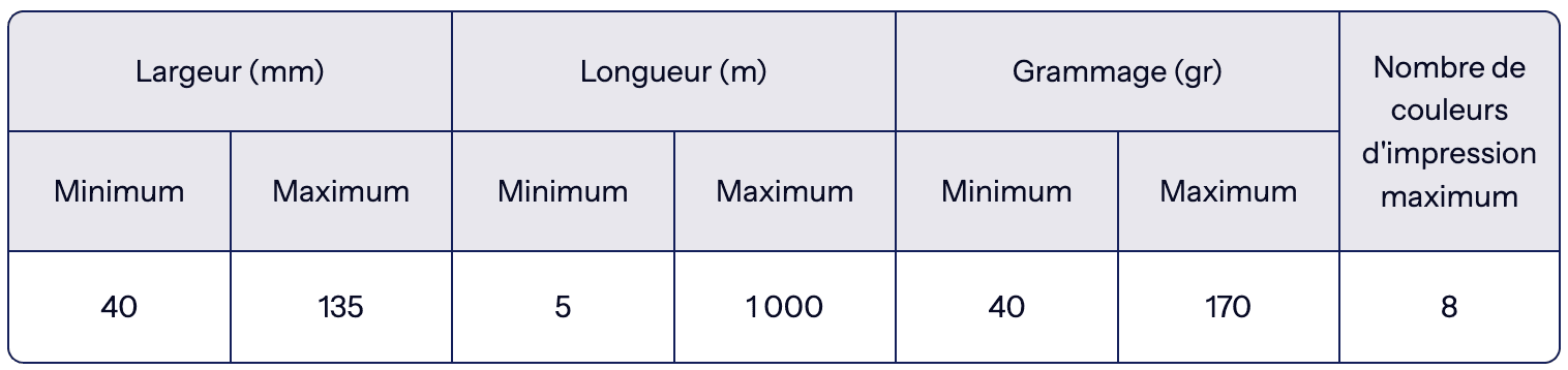 • Qualités possibles : colle acrylique et thermofusible, Eco Thermal, Top Thermal et papier couché.
